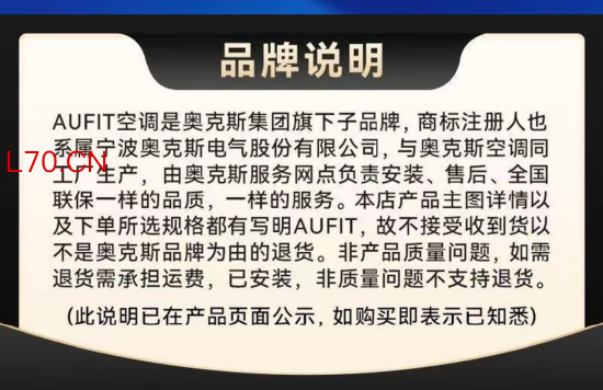 这样的案例发生之后,一些AUFIT空调店铺不得不专门制作了《关于AUFIT与奥克斯的一封答疑帖》,解释AUFIT与奥克斯的关系。甚至提前提醒,“本店产品主图详情以及下单规格都有写明AUFIT,故不接受收到货以不是奥克斯品牌为由的退货。”