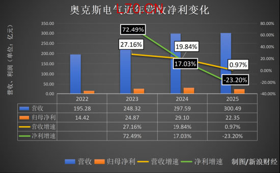 但这一次,“价格屠夫”也扛不住了。财报显示,奥克斯电气2025年取得收入300.49亿元,同比增加0.97%;母公司拥有人应占利润22.35亿元,同比减少23.2%。