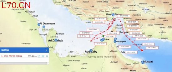 深圳报业集团记者查询船舶追踪数据系统得知,北京时间3月30日傍晚,“中海北冰洋”号与“中海印度洋”号从迪拜附近海域起锚,沿着伊朗最大岛屿格什姆岛与腊克岛之间的航线,以10.4节左右的航速,通过霍尔木兹海峡狭窄的出口,随后驶入阿曼湾水域。船舶追踪数据系统显示,这两艘船只预计4月6日抵达马来西亚的巴生港。