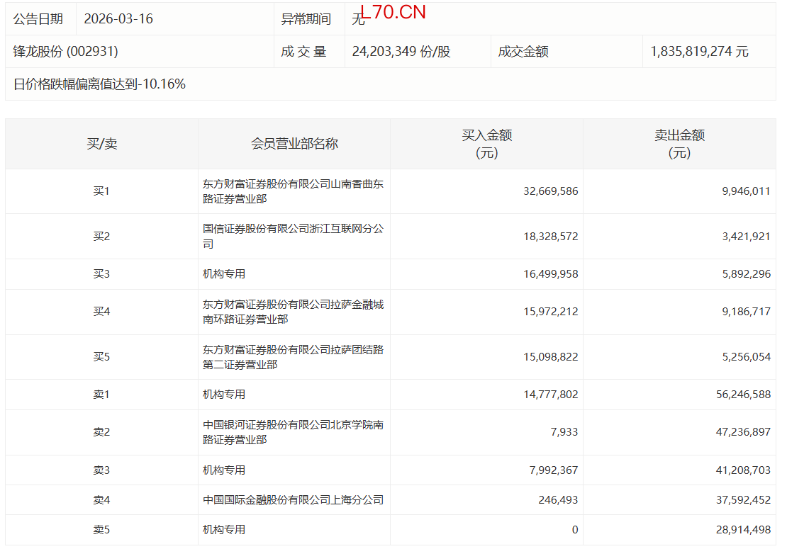 锋龙股份今日跌停,有3家机构专用席位净卖出1.04亿元