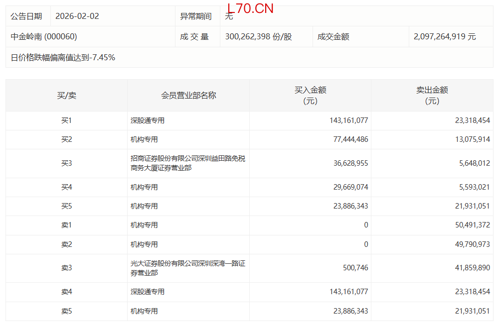 中金岭南今日跌停,有2家机构专用席位净卖出1亿元