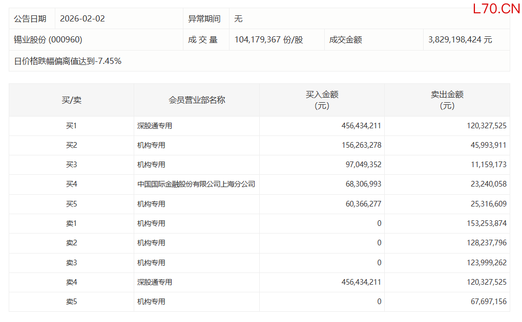 锡业股份今日跌停 四机构合计卖出4.73亿元实盘可查
